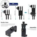 De meegeleverde mobiele telefoonhouder ondersteunt portret- en landschapsopnames met 360 graden rotatie. De verstelbare klem is geschikt voor telefoons met een breedte van 58-100 mm en biedt een stabiele kadrering voor vlogs en live content.