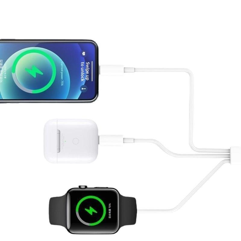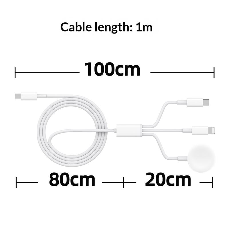 De 3-in-1 oplaadkabel is ontworpen om het dagelijks opladen te vereenvoudigen door meerdere functies te combineren in één praktische kabel. De kabel ondersteunt draadloos opladen voor Apple Watch, waardoor het een ideale oplossing is voor bureaus, nachtkastjes en op reis.