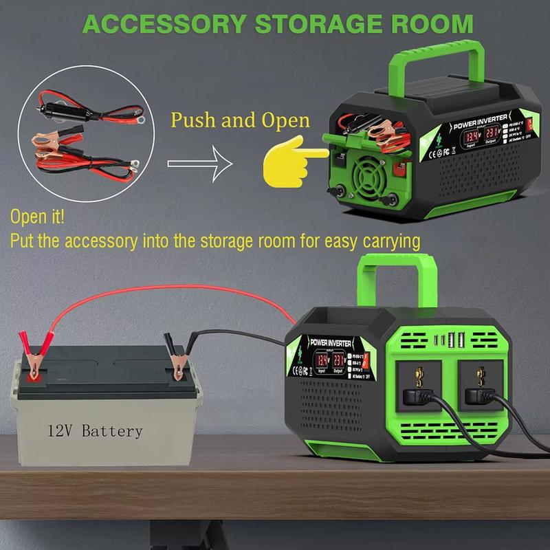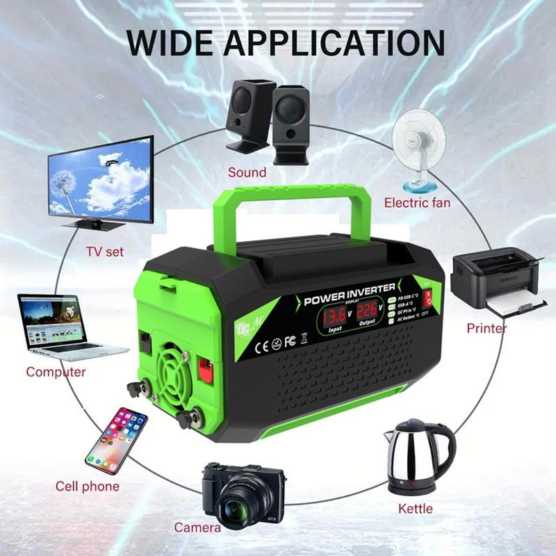 - Efficiënte omzetting van gelijkstroom naar wisselstroom - Zet gelijkstroom van 12 V om in wisselstroom van 220 V met een continu vermogen van 300W en een piekvermogen tot 600 W, ideaal voor laptops, tablets, CPAP-apparaten, camera's en andere draagbare apparaten.