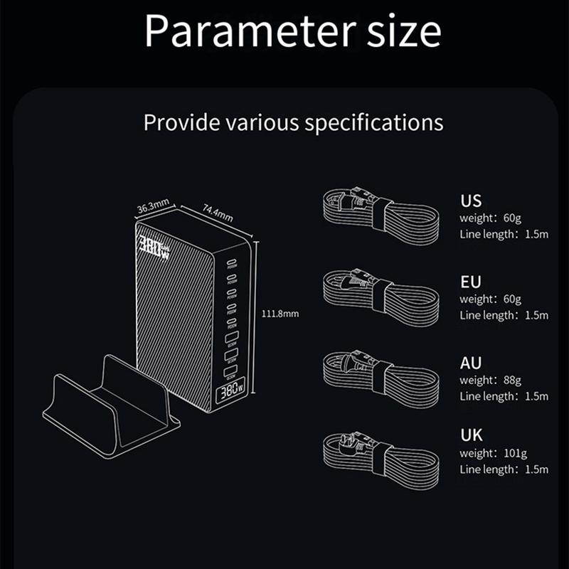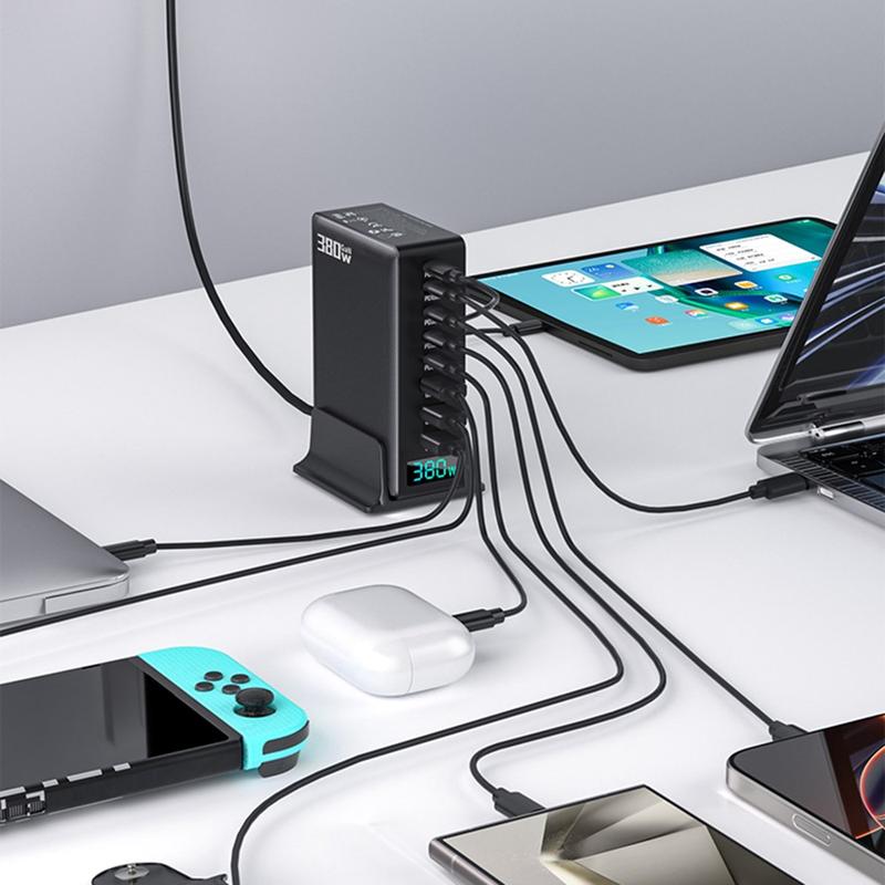 Laad je hele set-up op met een krachtig 380W GaN-bureaubladlaadstation dat is gebouwd voor moderne huizen en kantoren. Met 8 poorten (5x USB-C + 3x USB-A) en een digitaal energiedisplay kun je laptops, telefoons, tablets, koptelefoons, powerbanks en meer tegelijk opladen, terwijl je bureau schoon en georganiseerd blijft. GaN-technologie helpt bij het leveren van sterke prestaties in een compacte vorm, en ingebouwde veiligheidsvoorzieningen helpen het opladen stabiel en betrouwbaar te houden.