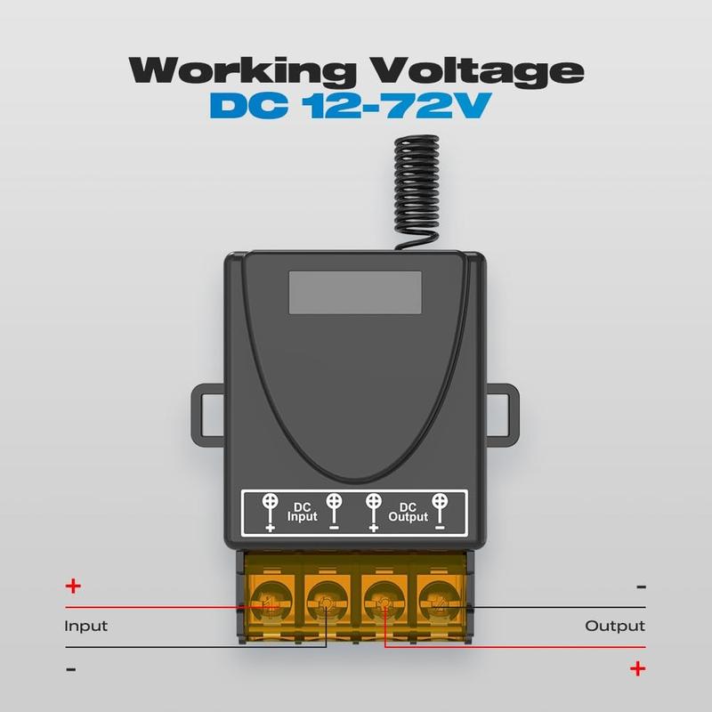 Bedien uw DC-apparaten draadloos met deze 433MHz RF-relaisschakelaar, ontworpen voor handige bediening op afstand voor een breed scala aan toepassingen. Geschikt voor 12V-72V-systemen, kan worden gebruikt met LED-verlichting, ventilatoren, motoren, pompen en bepaalde beveiligings- of automatiseringsinstallaties. De meegeleverde ontvanger en twee afstandsbedieningen bieden u flexibele bediening voor projecten thuis, in werkplaatsen, garages, poorten en apparatuur.