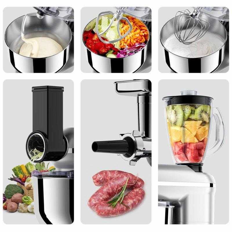 Vereenvoudig je keukenroutine met de multifunctionele keukenstandmixer van 5.5L, een alles-in-één apparaat dat is ontworpen om elke kook- en baktaak met gemak uit te voeren. De combinatie van de kracht van een deegkneder, mixer, blender, vleesmolen en citruspers zorgt voor professionele resultaten en dagelijks gemak in één compact apparaat.