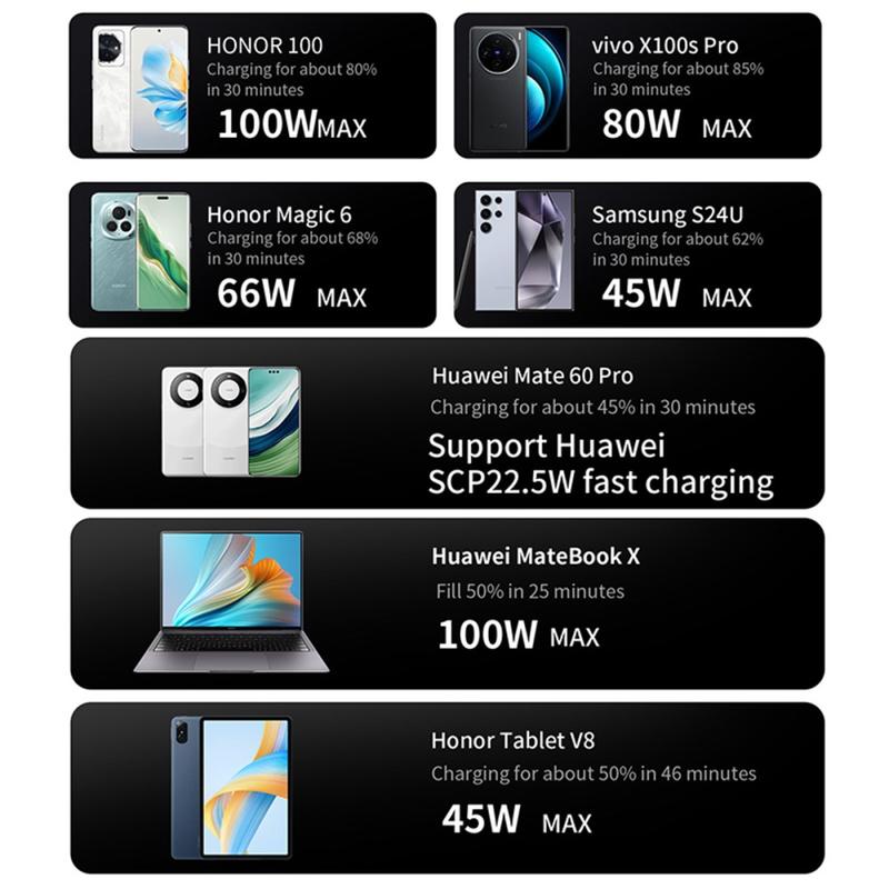 - Ondersteuning voor snel opladen: PD3.1, QC3.0 en andere gangbare standaarden