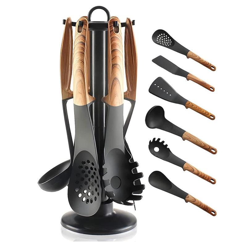 Upgrade je keukenbenodigdheden met deze 7-delige collectie hittebestendige kookgereedschappen, ontworpen voor dagelijks gebruik en moeiteloos koken. Met duurzame nylon koppen, ergonomische handgrepen met houttextuur en een handig opbergrek biedt deze set stijl, comfort en functionaliteit voor elke keuken.