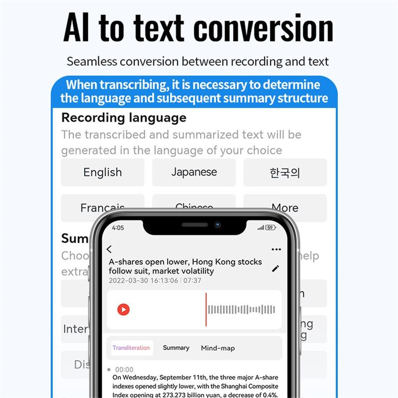 Gekoppeld aan de AIREC-APP via Bluetooth, kan deze dictafoon spraak in realtime omzetten in tekst in 188 talen. Het biedt ook directe vertalingen, waardoor het een essentieel hulpmiddel is voor het doorbreken van taalbarrières in het bedrijfsleven of op reis.
