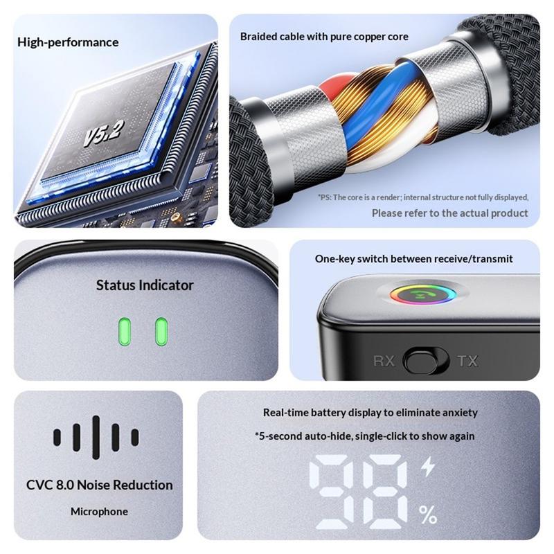De adapter wordt aangedreven door een geavanceerde Bluetooth 5.2-chip en biedt snelle koppeling, lage latentie en stabiele verbindingen. Hij ondersteunt meerdere audiodecoderingsformaten voor helder, gebalanceerd geluid tijdens het afspelen van muziek en telefoongesprekken.