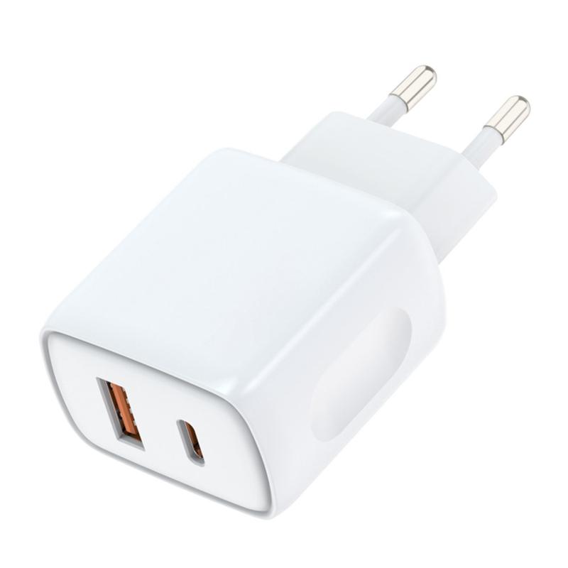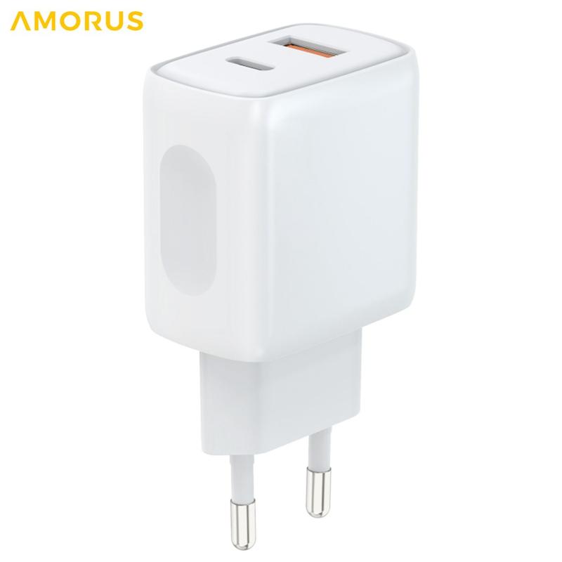 De AMORUS-wandlader met twee poorten combineert een USB-C PD-uitgang (tot 20 W) en een USB-A-snelle uitgang (tot 18 W), zodat u twee apparaten tegelijkertijd kunt opladen - ideaal voor smartphones, tablets, oordopjes, powerbanks en meer.