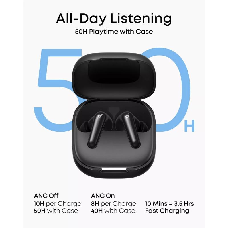 Met tot 10 uur afspeeltijd op één lading en tot 50 uur in totaal met het oplaaddoosje is de Soundcore R60i NC gemaakt voor langdurig dagelijks gebruik. Ondersteuning voor snelladen zorgt voor extra gemak, waardoor je tot 3 uur kunt luisteren na slechts 10 minuten opladen. Dankzij de IP55-water- en stofbestendigheid van de oordopjes zijn ze ook een betrouwbare keuze voor trainingen, gebruik buitenshuis en dagelijks gebruik.