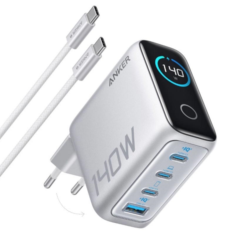 Desktoptopvermogen uit een baksteen van handpalmformaat. De Anker Zolo 140W lader, gebouwd met GaN transistors van de derde generatie, verzendt tot 140 watt via drie USB-C Power Delivery/PPS-poorten en één USB-A Quick-Charge-poort - genoeg om een 16-inch laptop, telefoon, tablet en oordopjes allemaal tegelijk op te laden. Een aanraakgevoelig display toont real-time wattage, poortstatus en oplaadtemperatuur, terwijl inklapbare pinnen en een antislipvoet de adapter stabiel in elk stopcontact thuis of in het buitenland houden. De achtvoudige bescherming beschermt aangesloten apparaten tegen hitte, piekspanningen en kortsluiting, waardoor dit de enige oplader is waarop je kunt vertrouwen, van een iPhone 15 Pro Max tot een DJI drone.