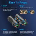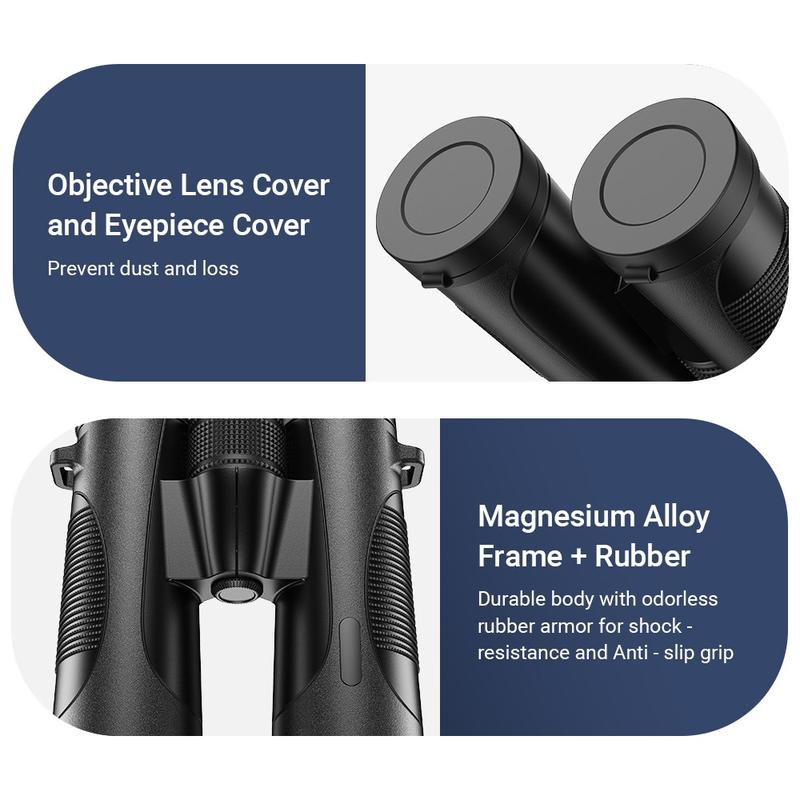 Deze verrekijker is ontworpen voor prestaties in alle weersomstandigheden en heeft een IPX7 waterdichtheid, zodat je zelfs in zware regen of vochtige omstandigheden goed kunt zien. De met rubber beklede buitenkant biedt een stevige, anti-slip grip en verbeterde schokbestendigheid voor robuust gebruik buitenshuis.