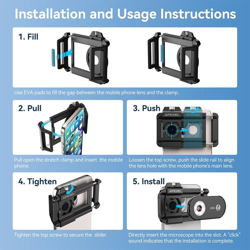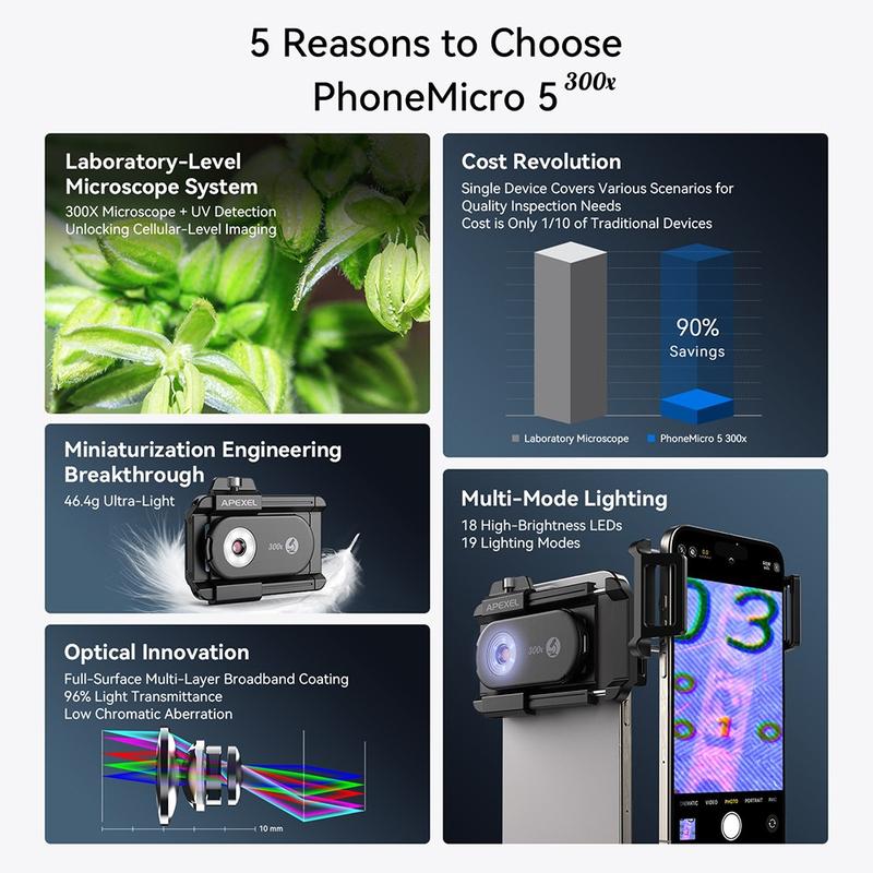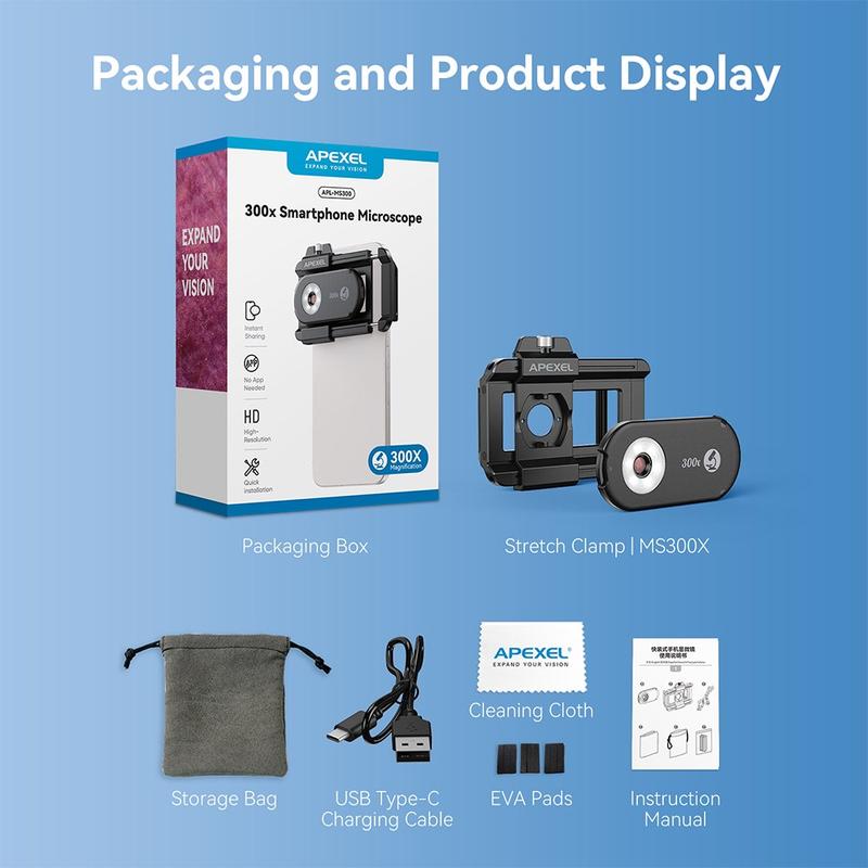 Verander je smartphone in een krachtige draagbare microscoop met de APEXEL APL-MS300 300X clip-on microscooplens. Dit compacte opzetstuk is ontworpen met optiek van professionele kwaliteit en geavanceerde verlichtingssystemen en brengt vergroting op laboratoriumniveau direct naar je telefoon - perfect voor liefhebbers van wetenschap, docenten, juweliers en technici.