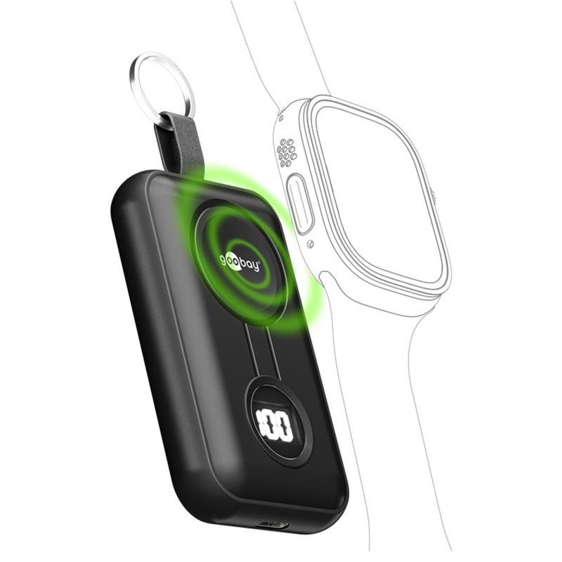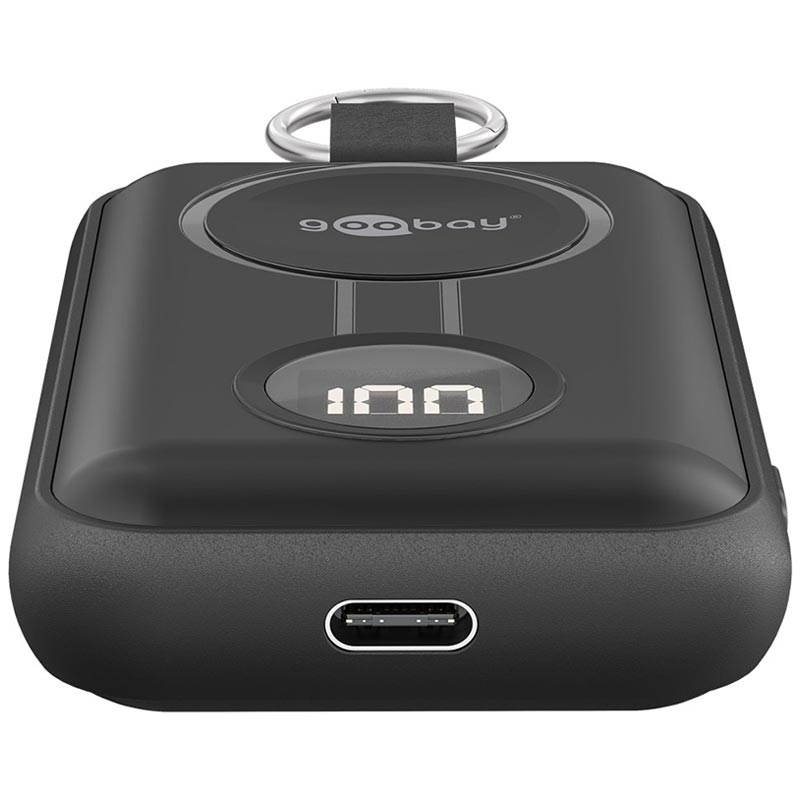 Goobay draadloze powerbank voor Apple Watch 2500mAh - magnetische horlogelader met USB-C, LED-display, sleutelring, 2,5W draadloos / 5W bedraad