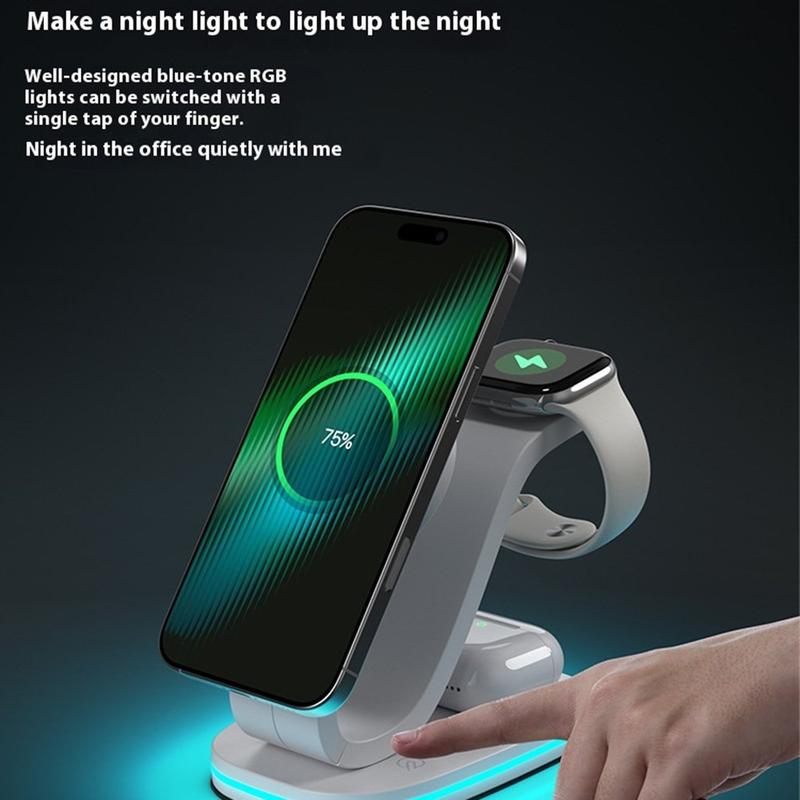 B-28 3-in-1 draadloze oplader met nachtlampje - voorzie je telefoon, horloge en oordopjes van stroom op één plek