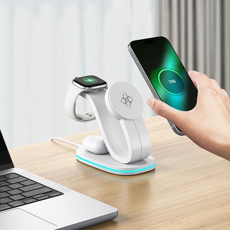 Vermijd rommel op je bureau met één standaard die snel 15 W draadloos opladen levert, je smartwatch oplaadt met 2 W, je oordopjes voedt met 3 W en ook dienst doet als een zacht nachtlampje.