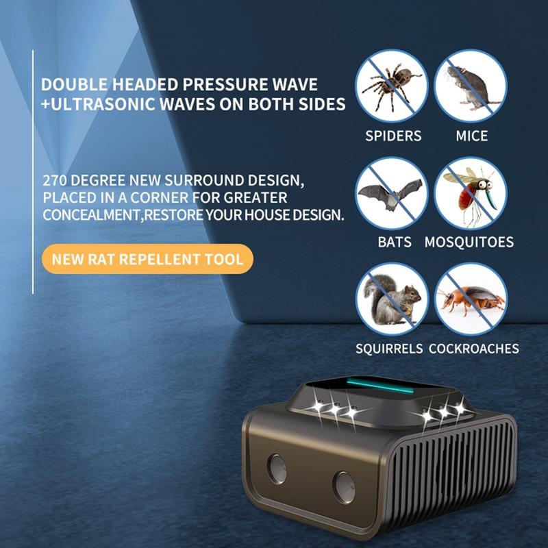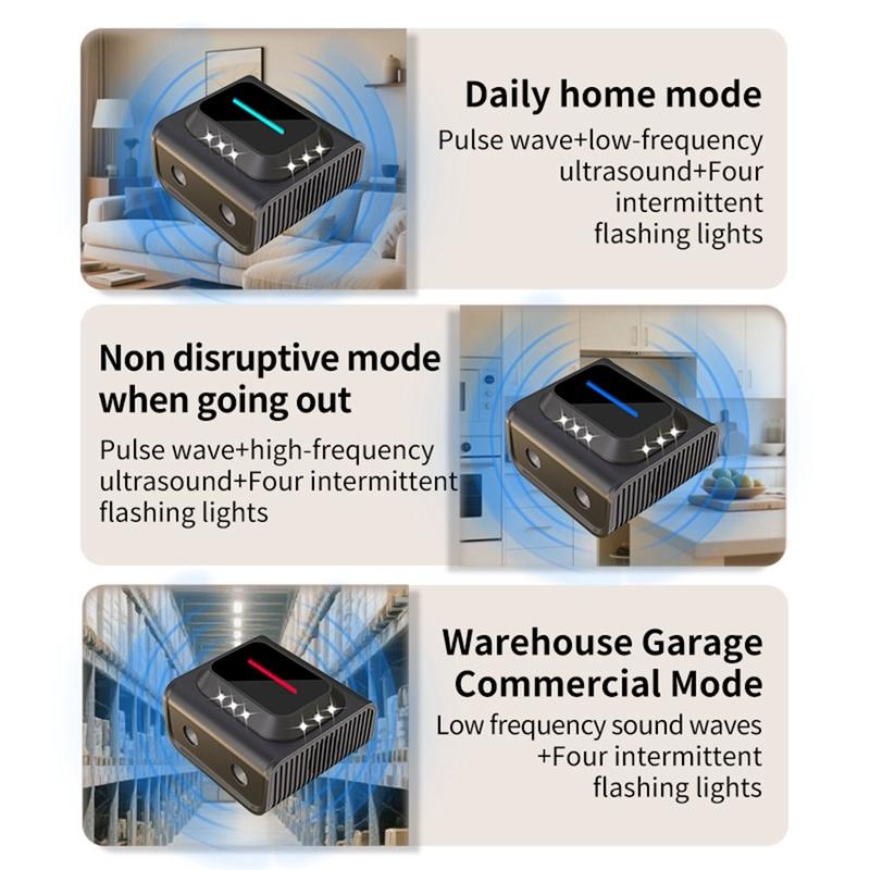 Door de combinatie van ultrasone golven, drukgolven met twee pulsen en een LED stroboscoop met hoge intensiteit creëert het apparaat een zeer oncomfortabele omgeving voor ongedierte terwijl het veilig blijft voor mensen en huisdieren.
