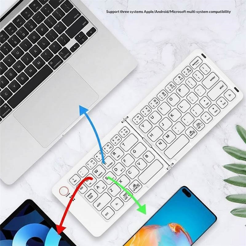 Het B023 68-toetsen magnetisch opvouwbaar draadloos toetsenbord is ontworpen voor mensen die onderweg werken en typen. Dankzij het slimme magnetische dubbel opvouwbare ontwerp kan het toetsenbord worden opgevouwen tot een ultradun, compact formaat dat gemakkelijk in een tas of zelfs een grote zak past. Met brede Bluetooth-compatibiliteit voor telefoons, tablets en laptops verandert het elke plek binnen enkele seconden in een productieve werkplek.