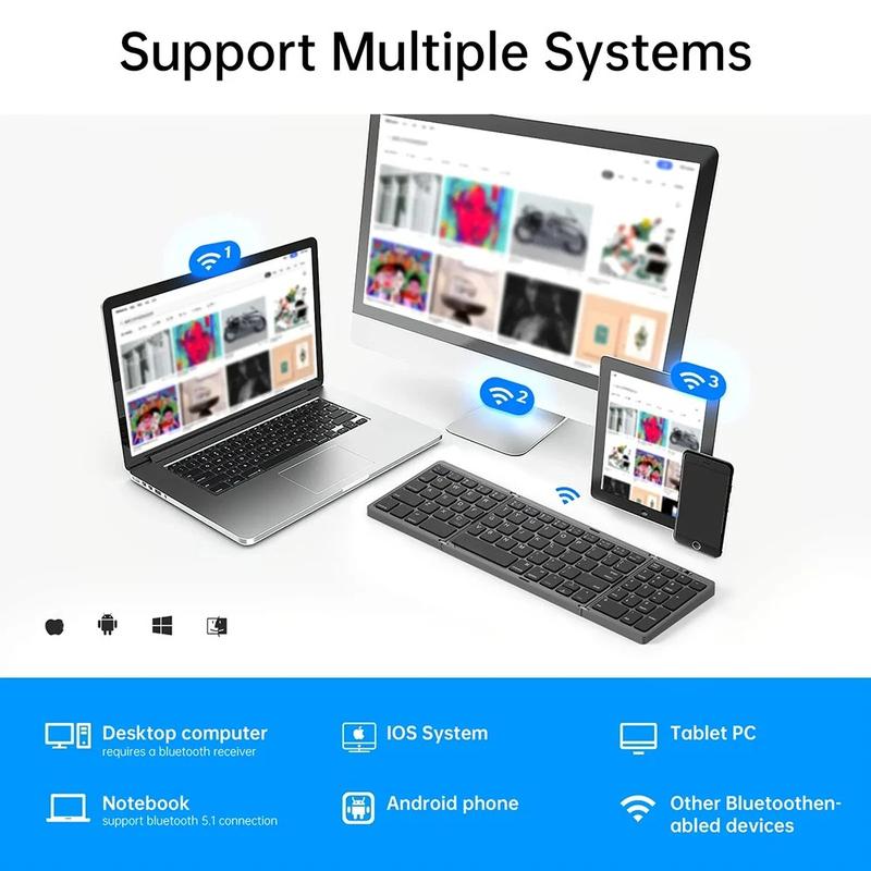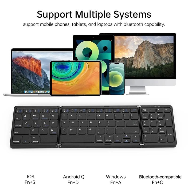Dankzij het slimme driemaal opvouwbare ontwerp is het toetsenbord gemakkelijk mee te nemen in een tas, rugzak of laptoptas, terwijl de magnetische sluiting ervoor zorgt dat het tijdens het vervoer stevig opgevouwen blijft. Met ondersteuning voor maximaal drie Bluetooth-apparaten kunt u soepel schakelen tussen uw telefoon, tablet en laptop met behulp van de speciale BT1-, BT2- en BT3-toetsen. Dit maakt het toetsenbord bijzonder handig voor multitasking op verschillende apparaten en besturingssystemen.