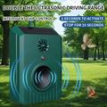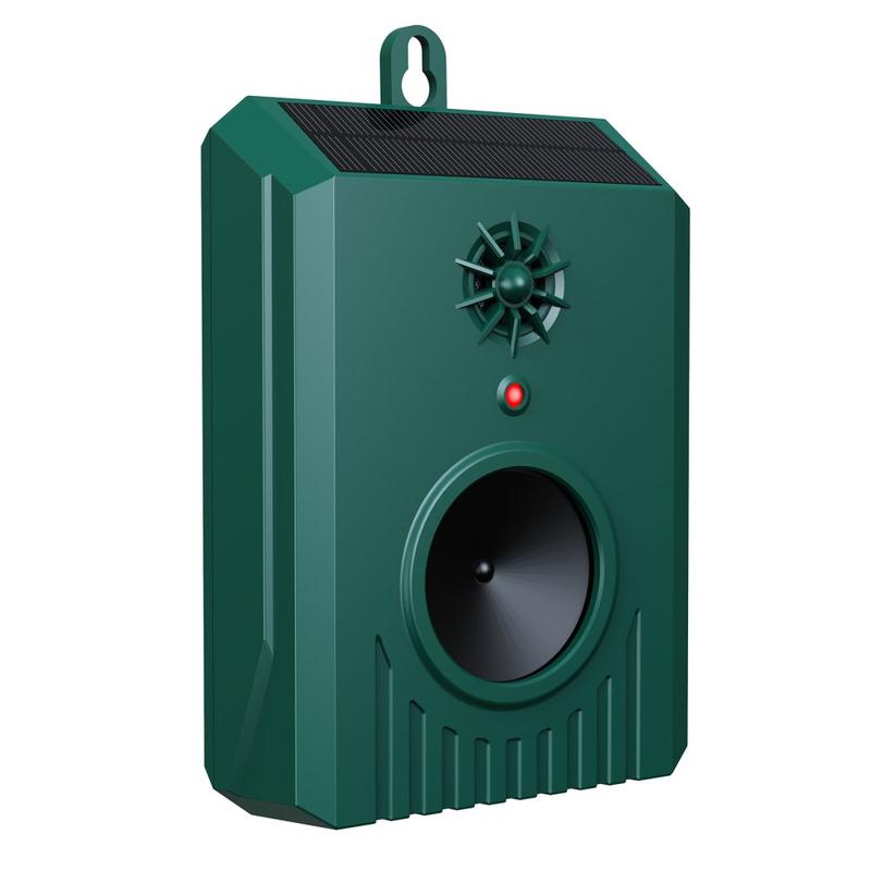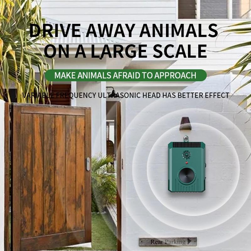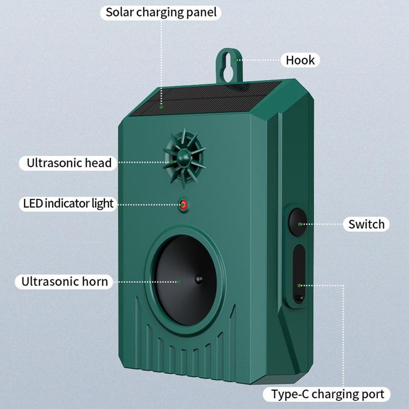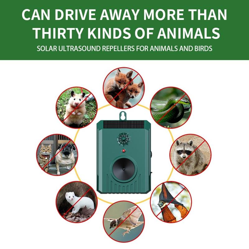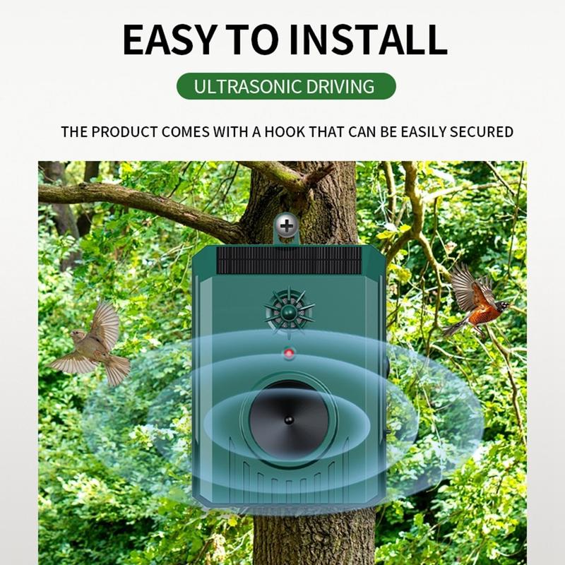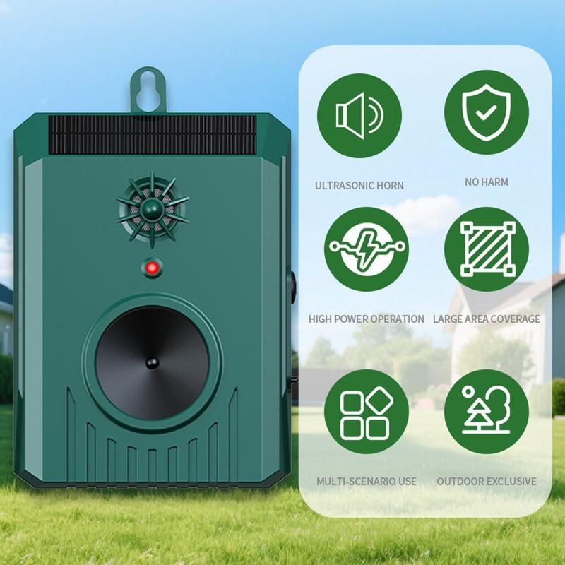 Door het combineren van ultrasone golven (8-35KHz) met hoorbaar geluid, schrikt het apparaat vogels, knaagdieren, vleermuizen, honden, eekhoorns en andere wilde dieren effectief af. Het ontwerp met dubbele werking verhoogt het succes van de verjaging voor een groter aantal soorten ongedierte.