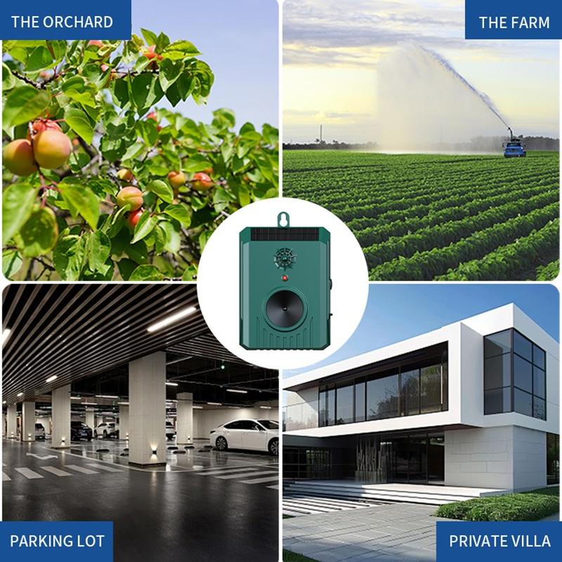 Ideaal voor tuinen, garages, villa's, boerderijen, parkeerplaatsen, magazijnen en algemene buitenruimtes. Het apparaat biedt een sterke dekking voor grote gebieden die een consistente afschrikking van ongedierte nodig hebben.