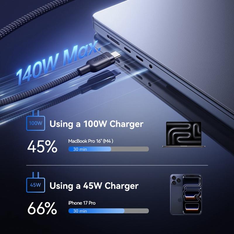 - 140 W USB-C-opladen wordt vaak geassocieerd met nieuwere normen voor het opladen van laptops met hoog vermogen onder PD 3.1