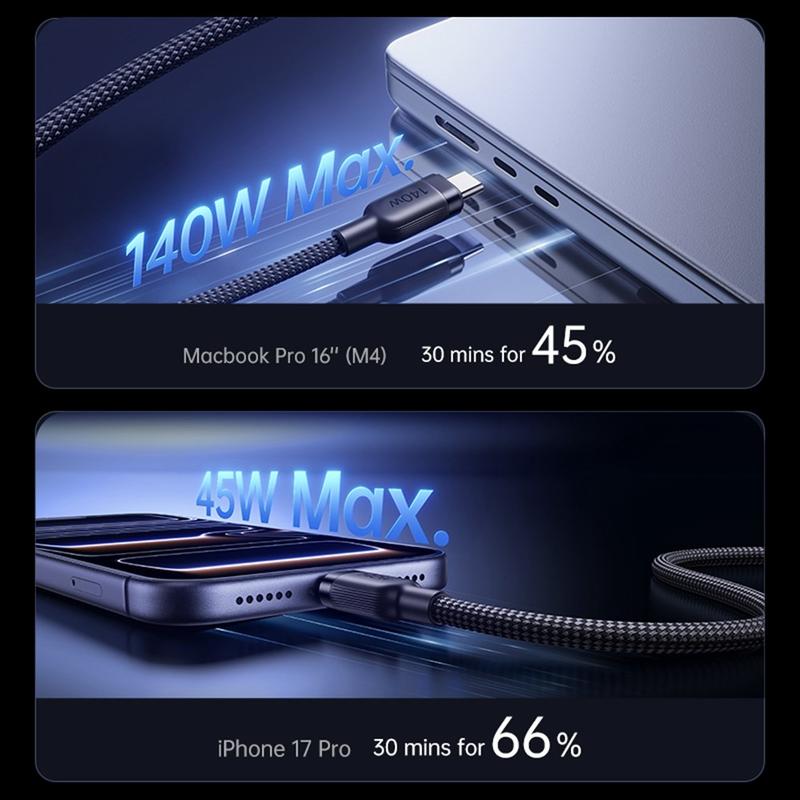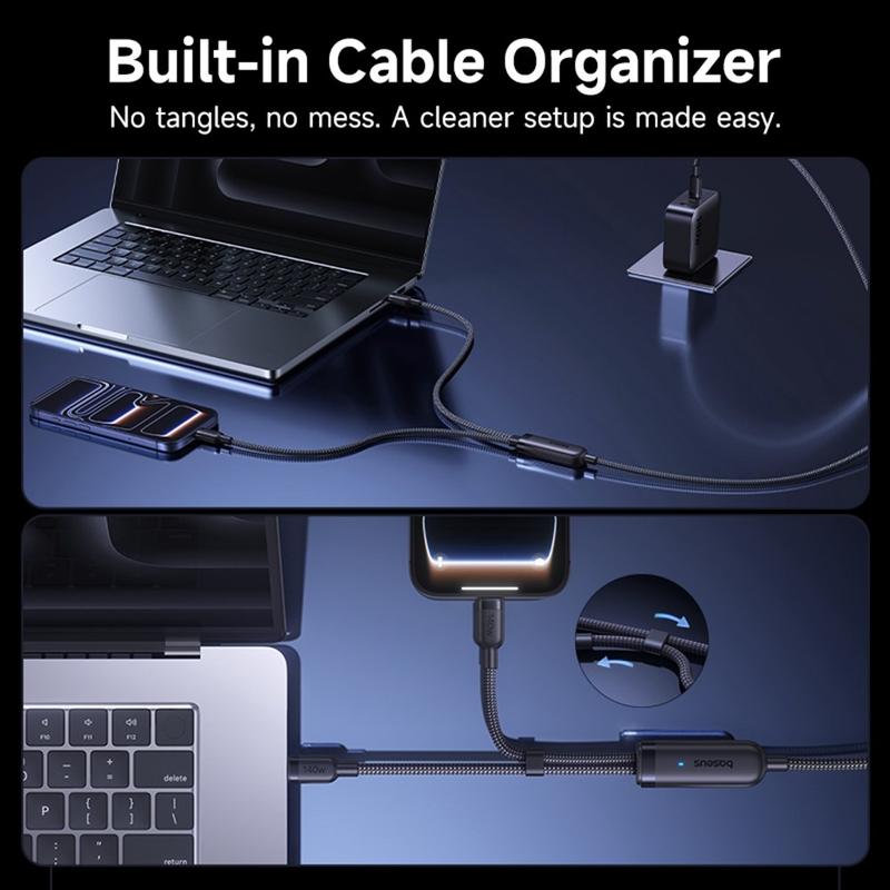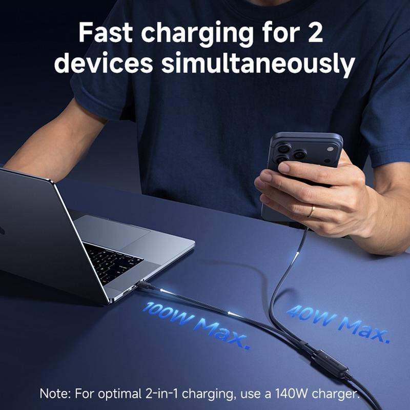 Laad twee apparaten op via één kabel met de BASEUS Flash 4 2-in-1 snellaadkabel. Deze slimme oplaadkabel is ontworpen voor moderne USB-C-apparaten en combineert een hoog uitgangsvermogen, brede compatibiliteit en praktisch kabelbeheer in één reisvriendelijke oplossing. Hij ondersteunt maximaal 140 W voor het opladen van één apparaat en kan het vermogen ook intelligent verdelen over twee apparaten tegelijk, waardoor hij ideaal is voor laptops, tablets, telefoons, draagbare consoles en meer.