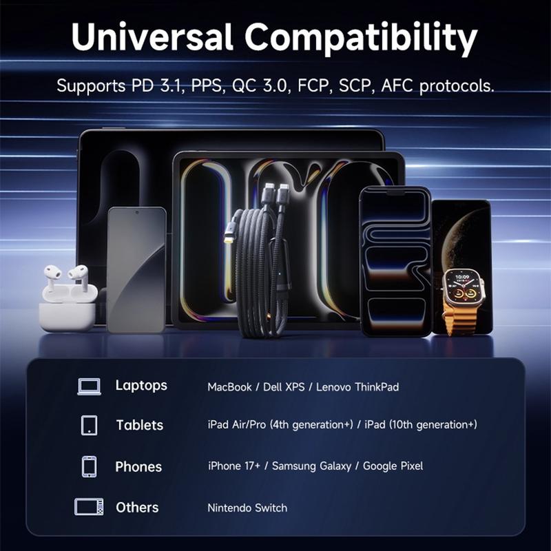 - Compatibel met vele USB-C-apparaten, waaronder MacBook, Dell XPS, Lenovo ThinkPad, iPad, iPhone 15/16/17-serie, Samsung Galaxy, Google Pixel en Nintendo Switch