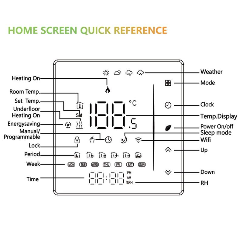 Deze thermostaat is gemaakt van duurzaam, vlamvertragend PC+ABS-materiaal en ontworpen voor langdurige prestaties en stabiele werking. Dankzij de bescherming tegen stroomuitval blijven uw opgeslagen instellingen behouden, waardoor u het apparaat na onderbrekingen minder vaak opnieuw hoeft te configureren. Het inbouwformaat past in een standaard wanddoos van 86 x 86 mm of een conventionele Europese doos, waardoor het geschikt is voor een breed scala aan interieurs.