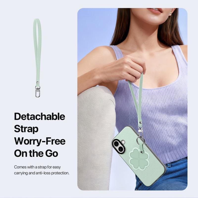 Er wordt een afneembare riem meegeleverd voor gemakkelijk dragen tijdens het reizen, woon-werkverkeer of dagelijkse activiteiten. Het biedt extra beveiliging tegen verlies en geeft je iPhone 17 een modieus accessoire tintje.