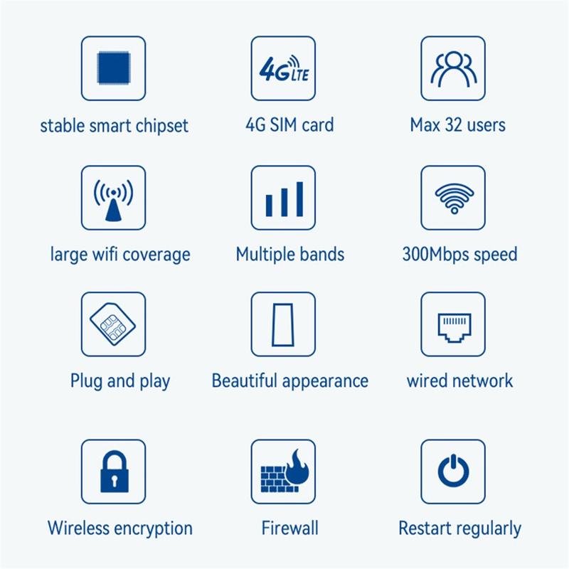 Zet uw 4G-signaal om in een Wi-Fi-hotspot met een bereik van 20-30 meter. De router ondersteunt tot 32 apparaten tegelijk en is dus ideaal voor huishoudens, kleine kantoren en gedeelde ruimtes.