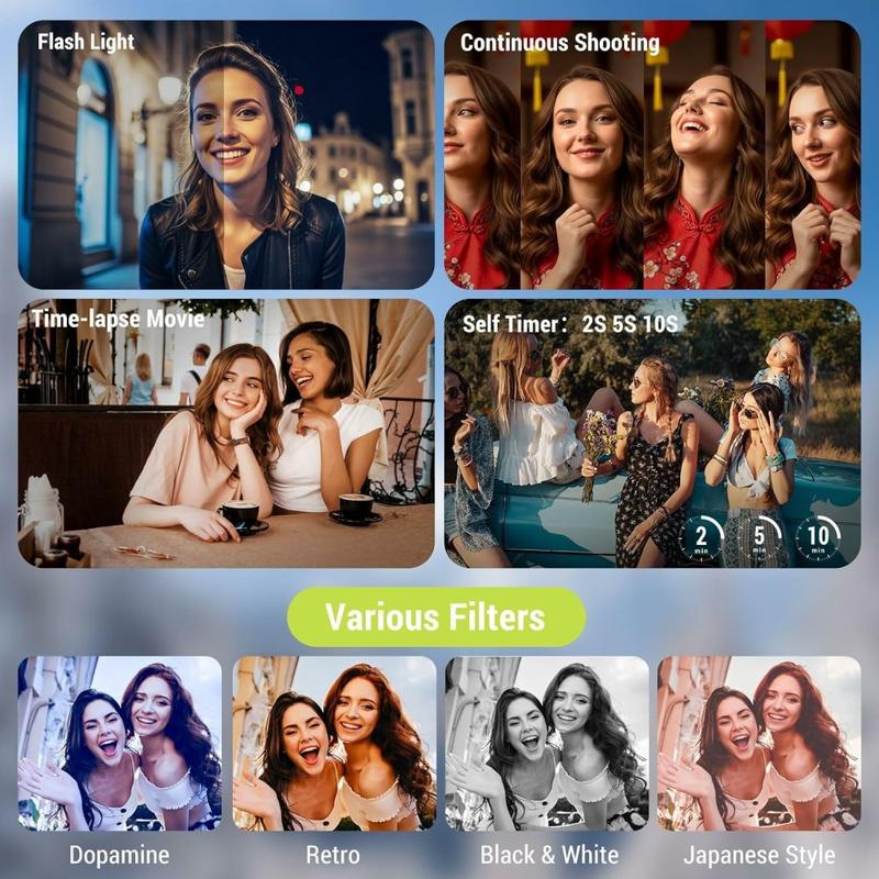 De CV21 4K digitale camera is ontworpen voor content creators, vloggers en alledaagse gebruikers die hoge kwaliteit video en foto's willen in een compact formaat. Uitgerust met een Sony 230D-sensor legt hij gedetailleerde beelden en vloeiende 4K-video's vast, terwijl het 270° draaibare scherm het kadreren moeiteloos maakt. Dankzij de krachtige digitale zoom, creatieve filters en meerdere opnamemodi is deze camera een veelzijdige metgezel voor vloggen, reizen en dagelijkse opnamen.