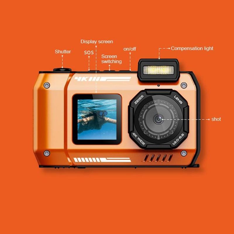 D50 waterdichte actiecamera met dubbel scherm - 65MP, IP68 - Oranje