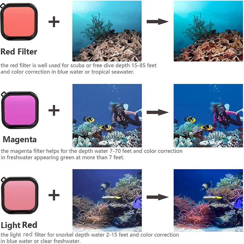 - Onderwaterfilters helpen kleuren te herstellen die op diepte worden geabsorbeerd, waardoor de beelden er natuurlijker uitzien