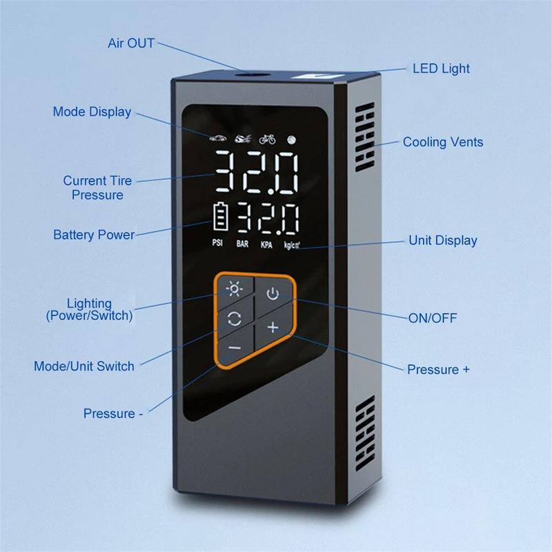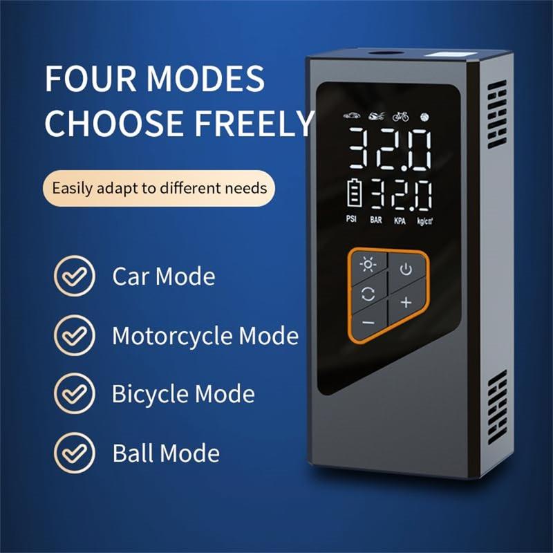 - Vooraf ingestelde bandenspanningsmodi - Biedt 5 vooraf ingestelde bandenspanningsmodi voor verschillende behoeften: Auto 26-50 PSI, Motorfiets 26-45 PSI, Fiets 30-65 PSI, Bal 4-16 PSI, Vrije modus 5-150 PSI voor handmatige aanpassing.