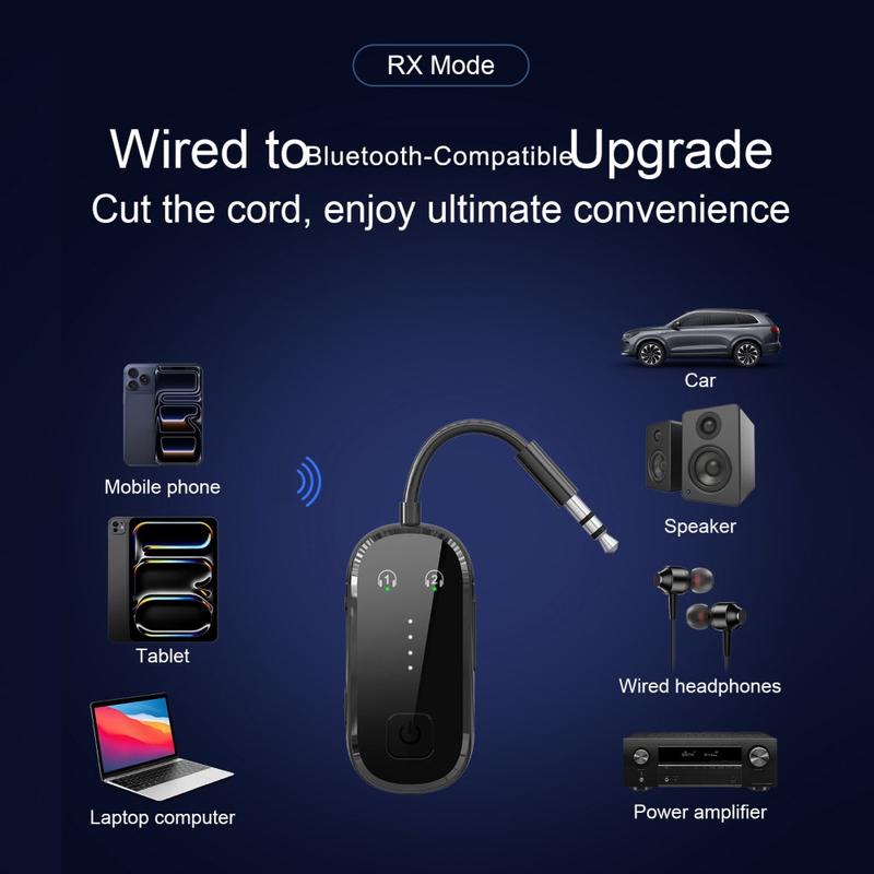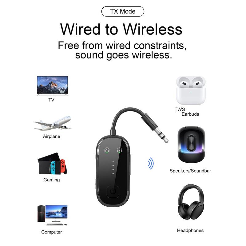 Dankzij Bluetooth 5.4-technologie biedt het apparaat een snellere respons, stabiele connectiviteit en efficiënte draadloze prestaties. In de zendmodus kan het audio van bedrade bronnen naar Bluetooth-hoofdtelefoons of -luidsprekers verzenden. In de ontvangstmodus kan het draadloze audio van uw smartphone, tablet of ander Bluetooth-compatibel apparaat ontvangen en dit via de 3,5 mm-aansluiting naar bedrade audioapparatuur sturen. Dual-link-ondersteuning biedt nog meer gemak door verbinding met twee Bluetooth-apparaten tegelijk mogelijk te maken, waardoor samen luisteren of schakelen tussen meerdere apparaten eenvoudiger wordt.