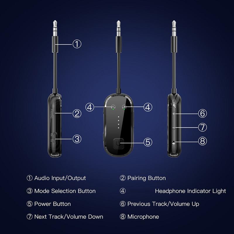 - Gebruik de TX-modus om een tv, pc of andere bedrade audiobron aan te sluiten op een Bluetooth-hoofdtelefoon voor draadloos luisteren