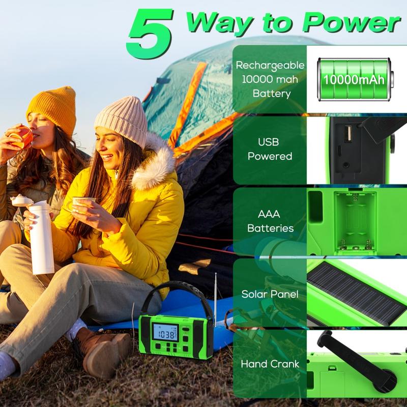 Je zit nooit zonder stroom dankzij vier veelzijdige oplaadmethoden: Zonnepaneel (0.1 W), handzwengelgenerator, Type-C ingang, AAA-batterij back-up (AAA-batterijen niet inbegrepen). Dit zorgt ervoor dat de radio stroom blijft leveren tijdens noodgevallen, kampeertrips, stormen en avonturen op afstand.