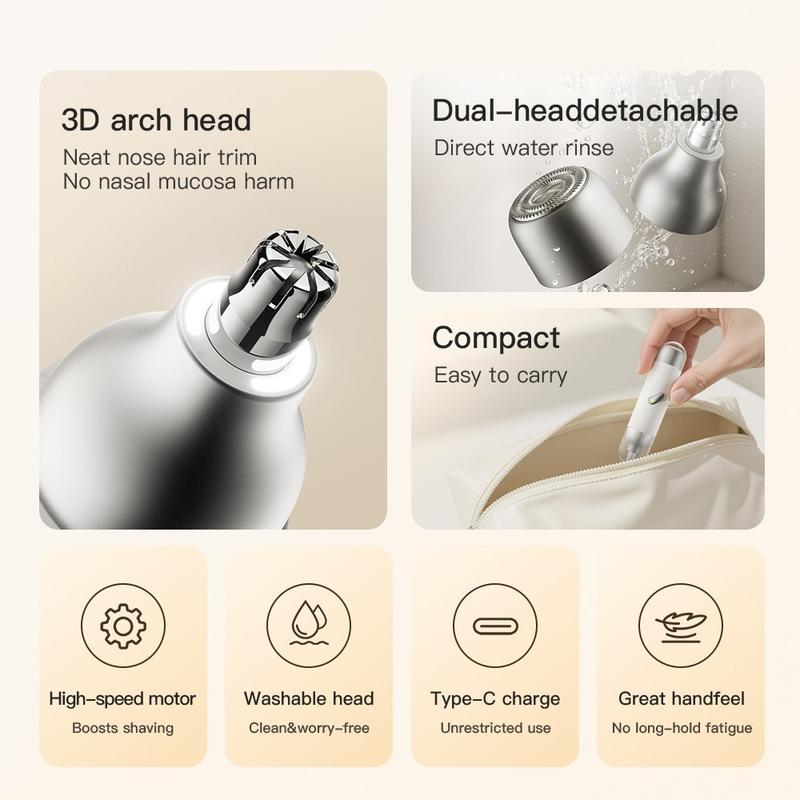 Houd je dagelijkse verzorging eenvoudig en nauwkeurig met deze elektrische neus- en haartrimmer voor mannen. Dit draagbare verzorgingsapparaat heeft een compact formaat dat in de palm van je hand past en combineert functies voor het trimmen van neushaar en het bijwerken van gezichtshaar in één apparaat, waardoor het een praktische keuze is voor thuis, op het werk, in je sporttas en op reis. Dankzij het kleine formaat is het apparaat gemakkelijk op te bergen en mee te nemen, terwijl het draadloze, oplaadbare ontwerp zorgt voor extra gebruiksgemak in het dagelijks leven.