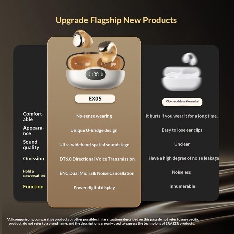 Geniet van comfortabel luisterplezier voor elke dag met de ERAZER EX05 draadloze oortjes met clip. Deze draadloze oortjes hebben een lichtgewicht, open-ear ontwerp met clip en zitten comfortabel zonder druk uit te oefenen op de gehoorgang, waardoor ze een praktische keuze zijn voor sporten, wandelen, woon-werkverkeer en dagelijks gebruik.