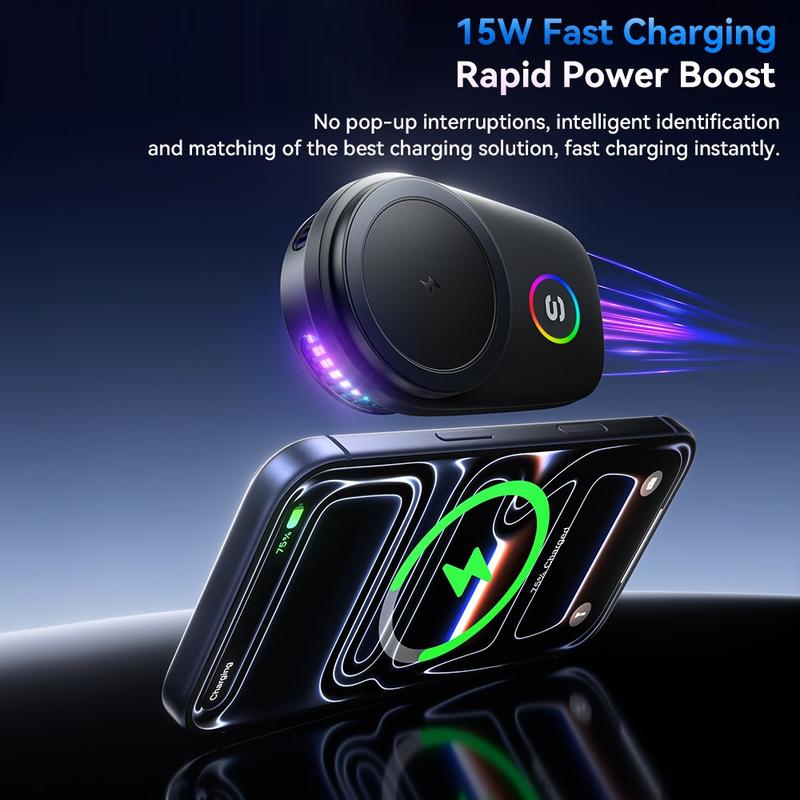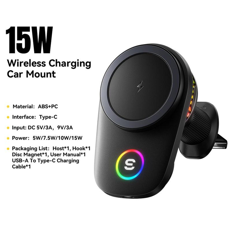 Houd je telefoon opgeladen, goed zichtbaar en stevig op zijn plaats met de ESSAGER 15W magnetische draadloze autolader. Deze ventilatieroosterhouder is ontworpen voor automobilisten die op zoek zijn naar een strakkere en handigere opstelling, en combineert snel draadloos opladen, een sterke magnetische bevestiging en actieve koeling in één compact accessoire. De ingebouwde RGB-verlichting zorgt voor een moderne uitstraling, terwijl je dankzij de 90°-draaifunctie eenvoudig kunt schakelen tussen staande en liggende weergave voor navigatie, telefoongesprekken of het bedienen van je muziek.