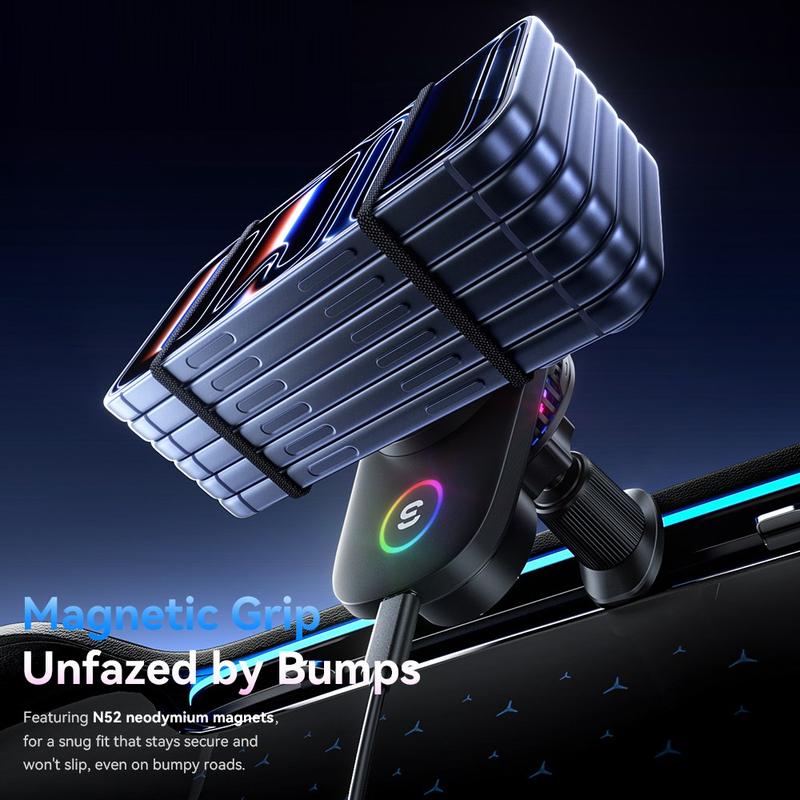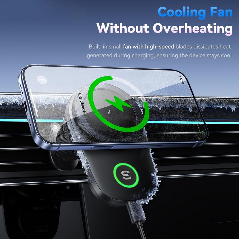 Dit is meer dan alleen een standaard autohouder. Hij biedt snelladen, een sterke magnetische grip en een veiligere manier om je telefoon tijdens het rijden in het zicht te houden. De ingebouwde koelventilator zorgt voor stabielere laadprestaties en de vergrendelbare ventilatieclip is zo ontworpen dat hij zelfs op oneffen wegen stevig blijft zitten. Het is een slimme upgrade voor iedereen die minder kabelwirwar, eenvoudiger gebruik met één hand en een luxere inrichting in de auto wil.