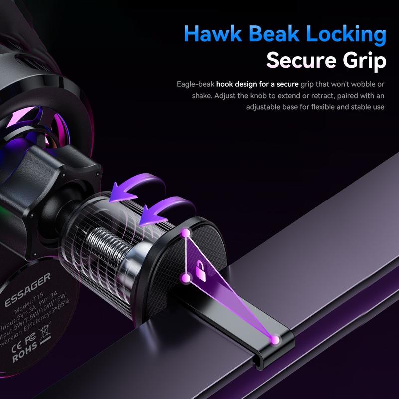 Als u op zoek bent naar een handigere opstelling voor onderweg, is deze ESSAGER-oplader een voor de hand liggende keuze. Hij combineert een stevige bevestiging, snel draadloos opladen, actieve koeling en stijlvolle verlichting in één compact accessoire, waardoor elke rit praktischer en comfortabeler wordt.