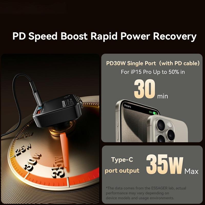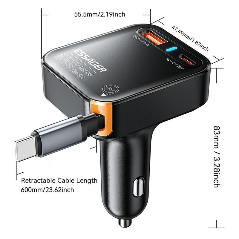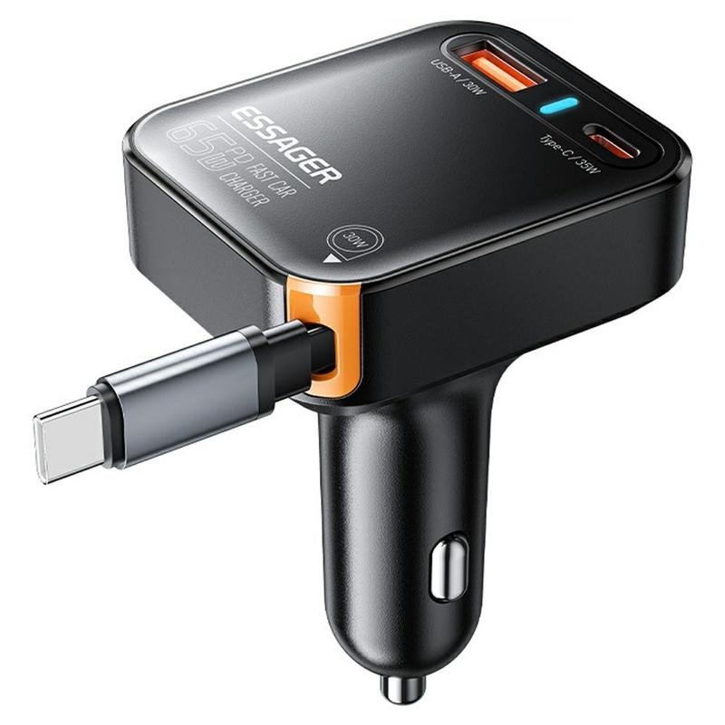 De ESSAGER 65W snellader combineert functionaliteit met een doordacht ontwerp. De intrekbare kabel houdt je auto netjes, terwijl het intelligente energiebeheersysteem ervoor zorgt dat je apparaten elke keer snel en veilig worden opgeladen. Compact, duurzaam en stijlvol - een must-have voor iedereen die veel onderweg is.