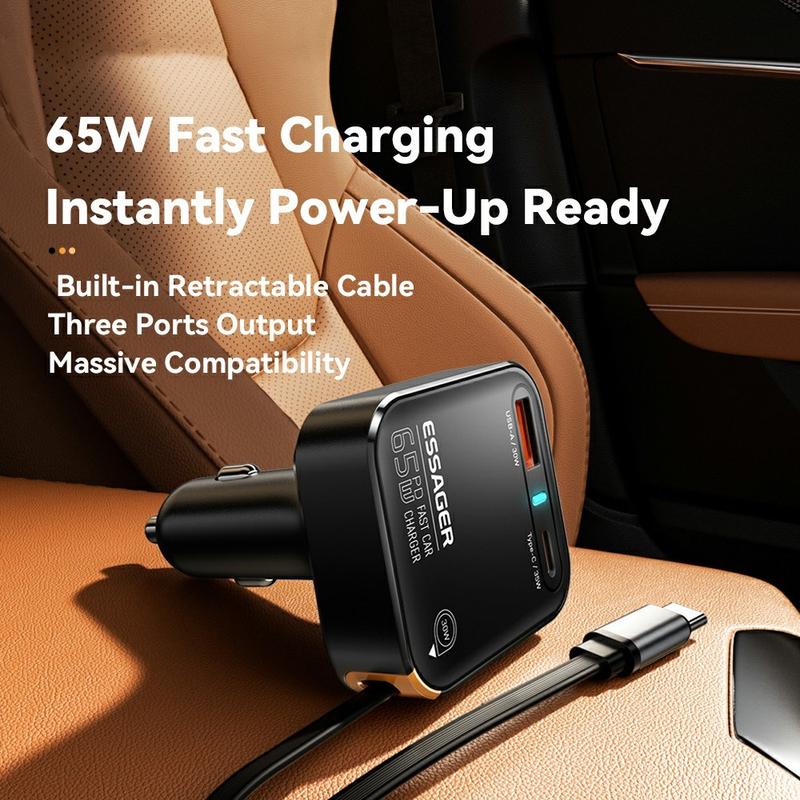 Essager 65W snelle autolader met intrekbare USB-C kabel - USB-A en Type-C poorten, slimme stroomverdeling