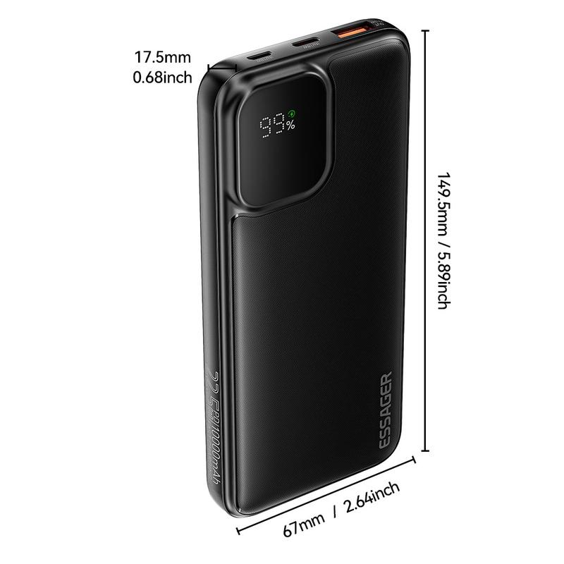 De ESSAGER 10000mAh Digital Display Power Bank is ontworpen voor moderne, snelle levensstijlen. Met twee ingebouwde kabels (Type-C en Lightning), een nauwkeurige LED-vermogensweergave en 22,5 W snel opladen, levert hij betrouwbare stroom onderweg zonder dat er extra accessoires nodig zijn. Perfect voor reizen, woon-werkverkeer en dagelijks gebruik.