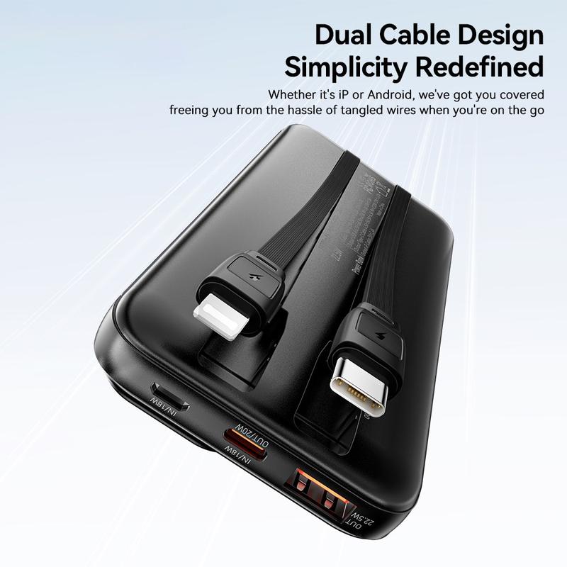 Uitgerust met geïntegreerde Type-C en Lightning kabels, maakt deze powerbank het meenemen van aparte snoeren overbodig - ideaal voor gebruikers met meerdere apparaten.