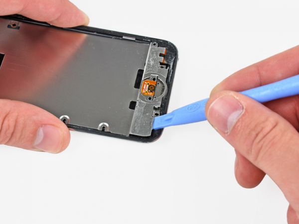 Gebruik de rand van een iPod openingstool om de dunne stalen cover van de camera aan de achterkant te wrikken.