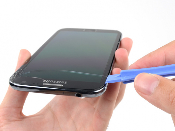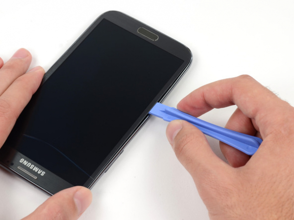 Plaats de plastic openingstool tussen de middenbehuizing en het frontpaneel aan de zijkant van de telefoon.