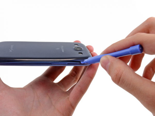 Voeg de plastic openingstool in de uitsparing in de opening tussen de achterkant en de rest van de telefoon aan de bovenkant van het apparaat.