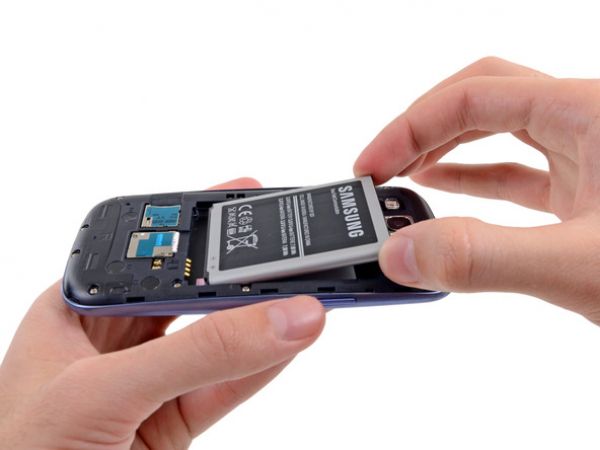 Plaats de plastic openingstool in de kleine opening boven de accu.