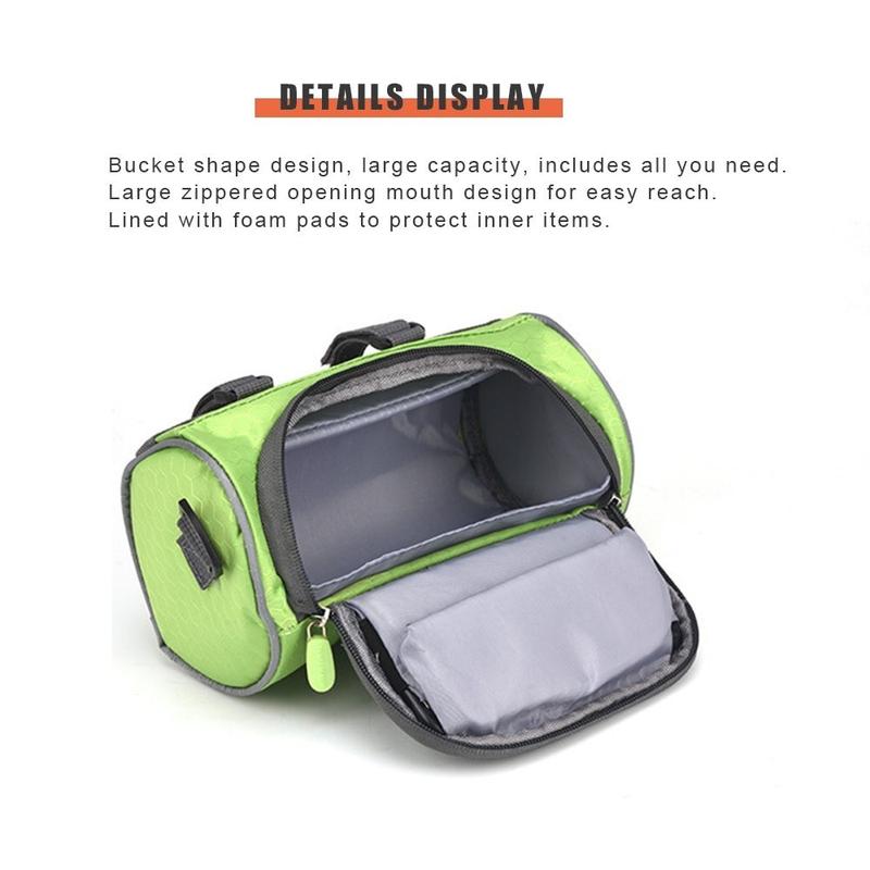 Deze stuurtas is gemaakt van waterdicht polyester + zacht PVC, gemakkelijk schoon te vegen en te reinigen. En de hele stuurtas is gevuld met schuim, dat niet alleen de interne onderdelen beschermt, maar ook de cilindervorm goed kan behouden.
